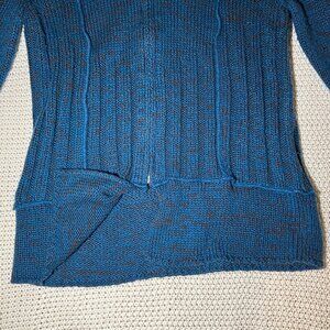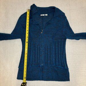 Cato women's sweater in size medium. It features a rich, multi-tone blue knit design with a full-length front zipper! This sweater has a fold-down collar and heavy stitching, giving it a stylish and cozy feel. This versatile piece can be worn as a top or as a light cardigan over another shirt.