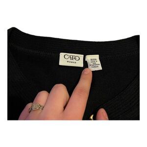 This Cato sweater is a classic addition to any wardrobe. With its solid black color and collarless design, it's perfect for any season - winter, fall, or spring. The rayon nylon blend material and knit fabric type make it comfortable and easy to care for with machine washing instructions. The pullover style sweater is available in size 18/20W, perfect for plus-sized women. The garment features no mention of condition, but its features include a solid pattern, and it falls under the category of women's clothing sweaters. Its brand is Cato, with a classic theme that will never go out of style.