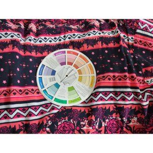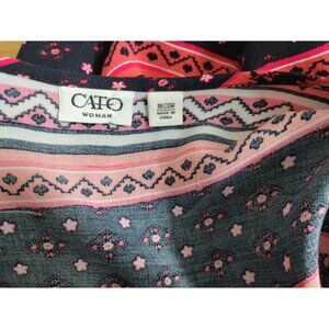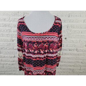 This is a women's tunic blouse made by Cato. It has a floral pattern in red and black, with lace detailing on the sleeves. The neckline is a boat neck, and the closure is a pullover style. The sleeves are 3/4 length and classic/fitted style. The material is rayon, and it is machine washable. It is a regular fit and size 18W. The blouse is an asymmetric style with an all-season design.