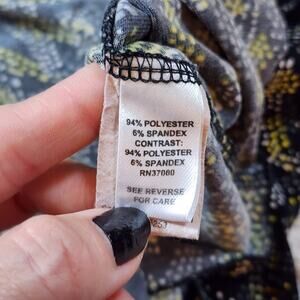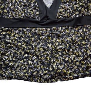 This Cato Women's Top in size 18/20W is a stylish and versatile pullover featuring a deep V-neck and short flutter sleeves. Made from a stretch knit of polyester and spandex, this top is perfect for both casual and business occasions. The black and green color choices and abstract speckled pattern add a touch of interest to the design. Easy to care for with machine washable instructions, this top offers a comfortable fit for plus size women. In very good condition.
