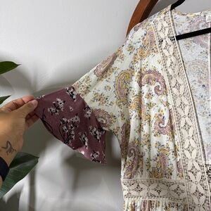 XL mixed floral ruffle crochet trim open front kimono cover up top from cato. Ties at the waist. Stretch. Lightweight. In great preloved condition. Thank you for visiting my closet and supporting a small business. Check out the rest of my closet for similar styles and sizes! Bundle three items and save 15%