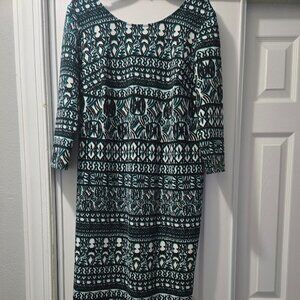 Cato dress with abstract tribal print in black, white and teal colors. 3/4 sleeves and zipper in back. Excellent condition.