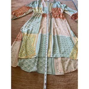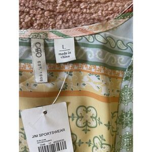 New with tags Cato women’s kimono cover-up in size Large featuring a colorful patchwork scarf print in shades of orange, green, yellow, and peach. Designed with an open front, self-tie drawstring waist, and long sleeves with elastic cuffs. Made of lightweight 100% polyester fabric, flowy and breathable, machine washable. Approx measurements: pit to pit 20” (51 cm), length 46” (117 cm). Perfect as a summer layering piece, beach cover-up, vacation wear, or casual boho cardigan. Excellent new condition with tags attached.