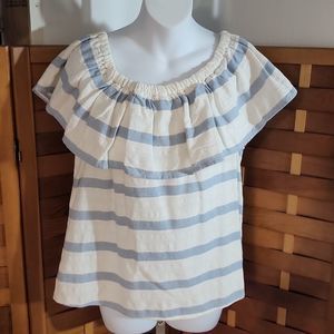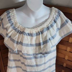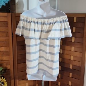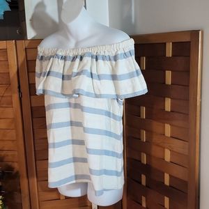 Cato brand off the shoulder blouse in a baby blue and white linen material. Elastic around the neck line to allow for wearing off or on the shoulder. Very good pre owned condition. Size Large. measurements laying flat are 22 inches across the chest from arm pit to arm pit and 24 inches in length from shoulder to hem.