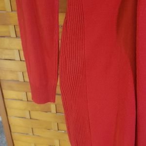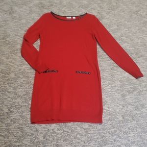 Cato brand red sweater dress with black leather accents. size med. banded hem. faux front pockets. very good pre owned condition. measurements are 18 inches across the chest from arm pit to arm pit and 36 inches in length from shoulder to hem
