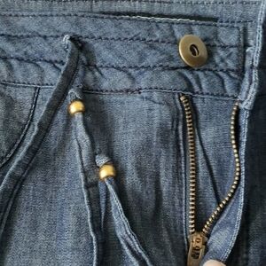 An adjustable tie at the waist is accented with gold tone beads. The front and back both have real pockets. The hem has decorative button tabs on the sides.