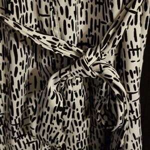 Cato dress top. Shirt sleeve v neck with pocket and button details on front. Tie at waist to accent shape. Lots of stretch for comfortable fit all day. Fun graphic print