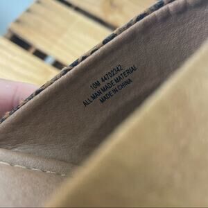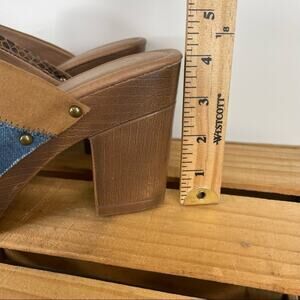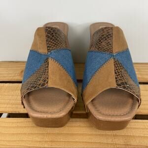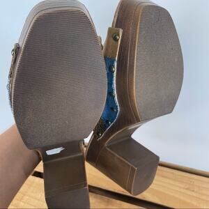In great preowned condition. Pattern block. Denim, snake skin and suede pattern. Slip on heel shoes. See heel measurements in picture.