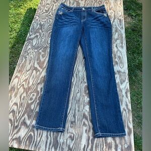 Cato premium contemporary jeans size 13. Preowned good condition- worn less than 10 times. Has embroidery & rhinestone detailing. 71% cotton 28% polyester 1% spandex.