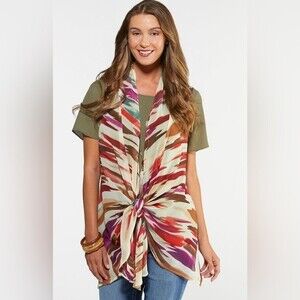 Beautiful fall colors line this lightweight semi sheer cardigan wrap top. Can be worn tied or open for your unique style. EUC