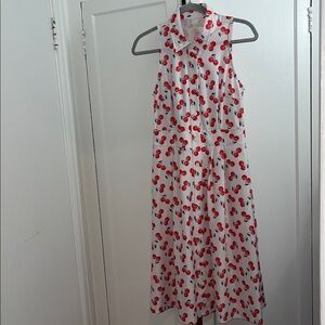 sleeveless, collared shirt dress in a white fabric with a vibrant red cherry print. The dress has a fit-and-flare silhouette, meaning it's fitted at the bodice and waist, then flares out into a knee-length or midi-length skirt. She completes the look with black strappy sandals and a bracelet on her right wrist.
