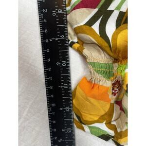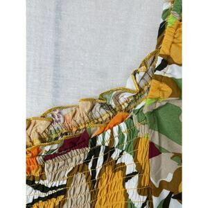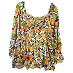 EUC Cato smocked flowy 3/4 length sleeve multicolored top, size 22. Beautiful top features colors of gold, green, orange and burgundy. Shoulders have light elastic banding with elastic smocking and gathering at wrists. Please see pictures for approximate measurements.