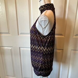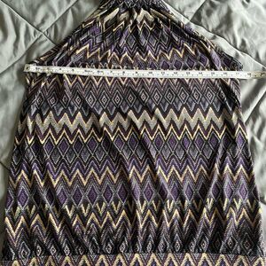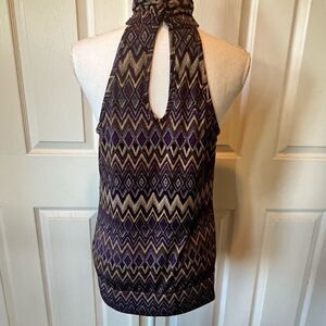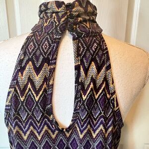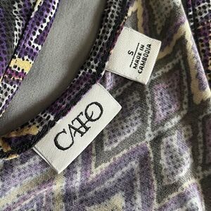 Cato Aztec Print Halter Top. Purple, gold, white and black. High neck. Peep hole back with 3 button closure. Fitted hem band for blousy look. Like new, perfect condition.