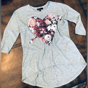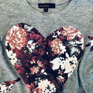 Women's size small Weavers heather gray top with pink & maroon floral heart graphic. Hangs slightly lower in the back. Clean and in like new condition. Non-smoking household. Approx 19" pit to pit across bust.