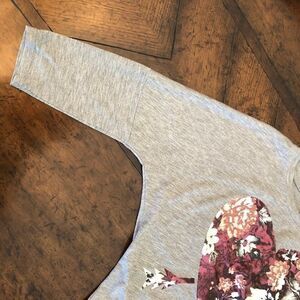 Women's size small Weavers heather gray top with pink & maroon floral heart graphic. Hangs slightly lower in the back. Clean and in like new condition. Non-smoking household. Approx 19" pit to pit across bust.