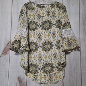 Cato Shirt Ladies Medium Yellow Semi Sheer Crochet Bell Sleeve Boho