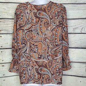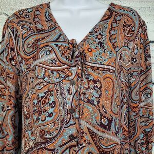 Cato Women’s Paisley Print Tie Neck Blouse L Boho Chic Long Sleeve Button Front