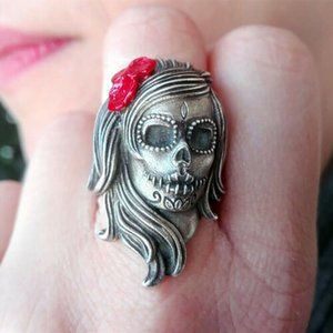Catrina Calavera Sugar Skull Rose Ring (Dia De Muertos/Santa Muerte). material: Stainless Steel. size: 7/silver, red rose. NWT. Mix & Match all Jewelry 20% bundles🌷 *Fast Shipping *We always use high-quality material in our products. We Ship Quickly and Package With Care!*