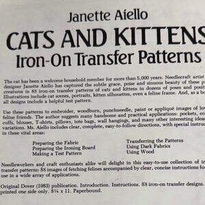 Vintage "Cats and Kittens Iron-On Transfer Patterns" by Janet Aiello. Published in 1983 by Dover Publications, this vintage trade paperback features 88 iron-on transfer patterns for needlework, painting or craft enthusiasts. With illustrations by the author,
