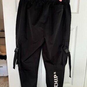 Modern Street Wear!!! "YEYEHIP" in excellent condition for the young adults in your life. Two large square pockets with straps on each side. "Yeyehip" printed in white on back of right leg. Cuffed Bottoms. Fits Baggy. Cinched/Adjustable waist. Five pockets in total.