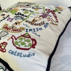 Catstudio Ireland Hand‑Embroidered Pillow, approximately 20″ × 20″, made of organic cotton with black velvet piping and a button‑closure back. This piece was hand‑embroidered in India (takes ~40 hours), featuring a whimsical Ireland map design with key landmarks and cultural motifs.