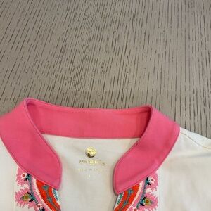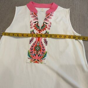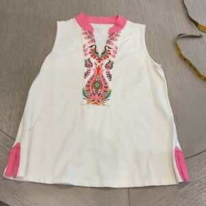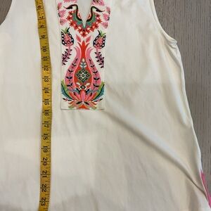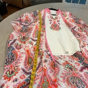 I’m selling as a set since the decorative v sleeveless shirt matches perfectly the coverup. The coverup is a small but it fits like a large. The v neck is a large. Measurements on pictures.