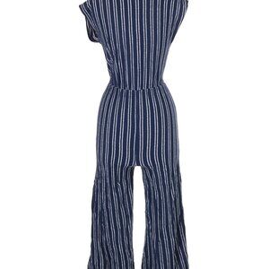 Chic navy jumpsuit with white stripes. Relaxed fit with a cinched waist. Perfect for casual outings.