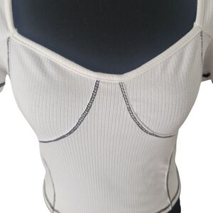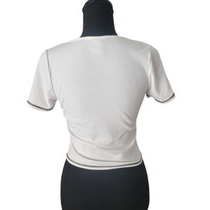 Stylish ribbed crop top with contrast stitching. Features a flattering neckline and short sleeves.