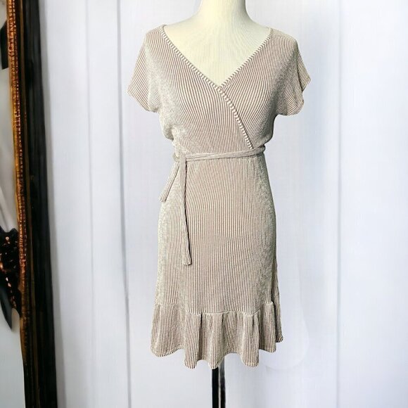 Supr soft dress. Faux wrap. Fabric is slightly ribbed with small tan and off white stripes. Fun and Cute. Stretch waist band. Ruffled bottom. Cap sleeve.