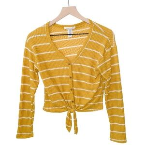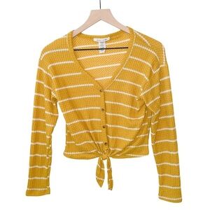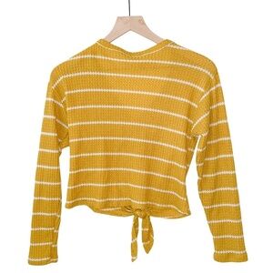 Caution to the Wind Soft Mustard Yellow Knit Long Sleeve Front Tie Cropped Shirt Small