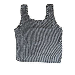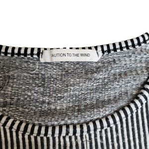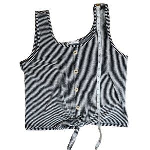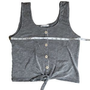 This Caution to the Wind Stripe Crop Top with a twist bottom is a fashionable piece for women. It features a bold black and white stripe pattern and has no size tag. see measurements.