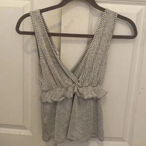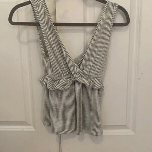 This is a small caution to the wind gray and white striped tank top. Has a little raffle around the middle. It is super soft 55% rayon, 41% polyester 4% spandex.