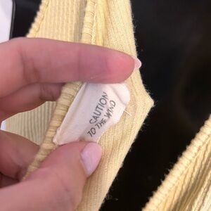 In great condition! Yellow ribbed v neck dress with tiered skirt. Very stretchy. Missing a size tag but I was told it’s a medium from the show I purchased from. Brand is caution to the wind.
