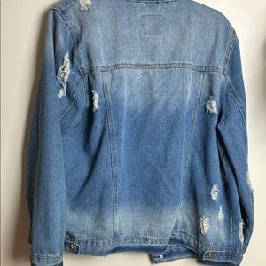 Stylish denim jacket with distressed accents. Light blue wash. Perfect for everyday wear.