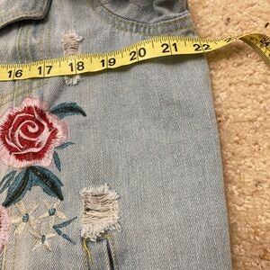 Cavalini light wash distressed denim jacket with floral embroidery. Women’s size medium. Super cute denim jacket with embroidered roses. Four front pockets. Perfect for cooler spring and fall days, or chilly summer evenings. In excellent condition with no rips, holes, or stains!