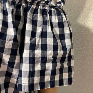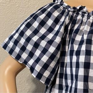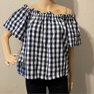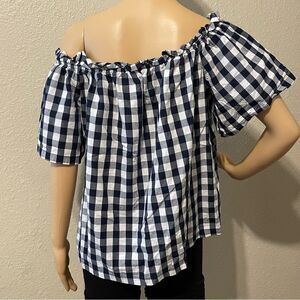 Cavalini Shirt Sleeve Off Shoulder Gingham Checkered Blouse Navy Blue White XL