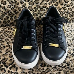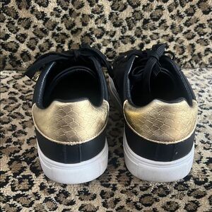 Step out in style with these chic black and gold women's sneakers. Perfect for any casual outing, these shoes offer both comfort and elegance.