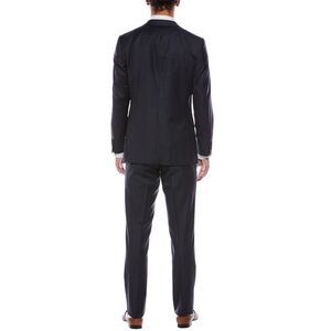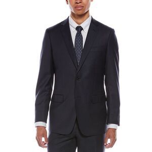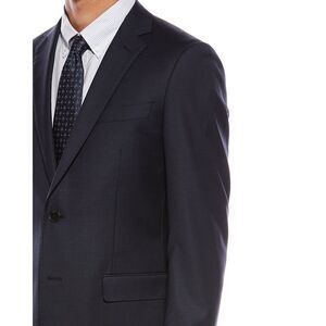 Note: There is a 6in drop in size from the jacket chest size to the pant waist size. For example, a size 40 jacket comes with size 34 pants. Please note: Size selections are European. For US conversions, please reference the size chart. Color/pattern: navy Jacket: Approximately 29.5in from shoulder to hem Design details: notch lapel, left chest pocket, two front pockets, non-functional button cuffs, three interior pockets, and side vents at back Two-button closure Pant: Design details: belt loops, four-pocket styling Zip fly with slide tab and button closure Unfinished hem for easy tailoring Model is 6'1.5 and is wearing a size 50. Measurements may vary slightly by size. Shell: 100% wool Lining: 55% polyester, 45% viscose Dry clean only Imported