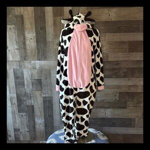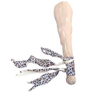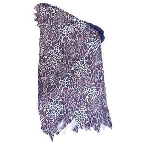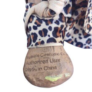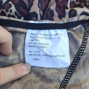 The tunic is old from Spirit Halloween/Spencer Gifts and is a men's size medium 36-42. The measurements are 42 inches at the chest, 52 inches at the hips, and 39 inches from shoulder to hem. The fabric is a cheetah print (tan, beige, brown, black) with the top of the front having a strip of fake black fur. It is 80% polyester and 20% acrylic. The care instructions are to hand wash and line dry. The tunic is in excellent condition, no defects.