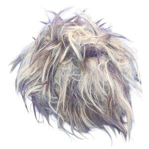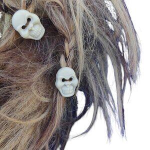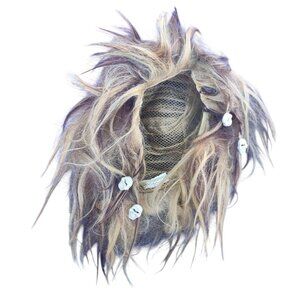 The wig seems to be from Heaven Costumes in the style "Crazy Caveman Wig". It is a combination of blond and brown 100% synthetic hair. There are two small braids on each side with white sculls sewn into the bottom of them. The wig does show use, but within reason of a messy wig.