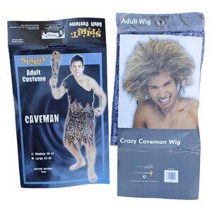 Caveman Costume Men Size Medium 36-42 (Tunic, Wig, Club, Shoe Covers) Halloween
