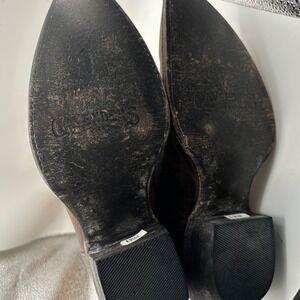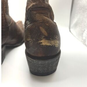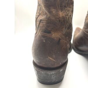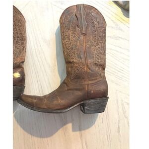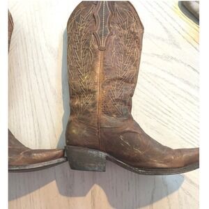 Keywords: Cowboy boots, Western boots, Leather boots, Vintage boots, Brown boots, Stitch detail, Womens boots, Size 6.5, Made in Mexico, Distressed leather, Pointed toe, Riding boots, Rustic, Classic western