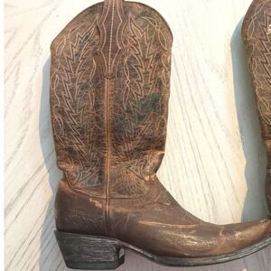 Beautifully crafted cowboy boots featuring intricate stitch detailing.m and gold brush strokes. These boots boast a classic western design with a snip toe and a comfortable heel height. They have a rich, distressed coloring that adds to their style of a worn in look! These boots were made in Mexico.