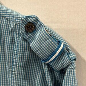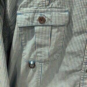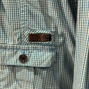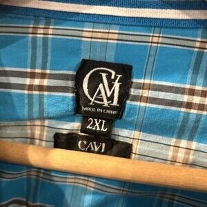 Cavi Shirt Mens 2XL XXL Long Sleeve Front Pockets Shoulder Buttons Aqua Check Approximately 25 across chest and 30 total length Several accents Roll tab sleeves One small button missing on left wrist (see pic) Good condition