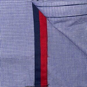 100% Cotton. Contrast solid Reg & Navy placket and inner cuff