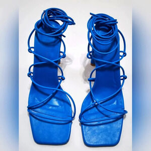 The Cayara Heel by Billini features a stunning ocean blue color with wide chunky heel and lace-up wrap-around straps. Its square toe design and flat thin soles provide a trendy yet comfortable look. Available in size 8, these sandals are perfect for making a stylish statement. worn once.