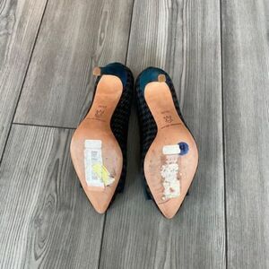 Wool pumps with houndstooth tweeted fabric design, bowl detail in front and leather suede heel.