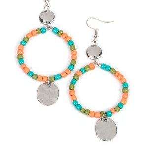 Featuring summery hues, dainty coral, Basil, and Harbor Blue seed beads are threaded along a wire hoop that swings between two hammered silver discs for a tropical inspired fashion. Earring attaches to a standard fishhook fitting.