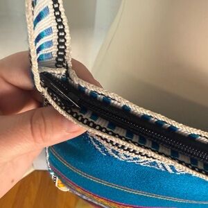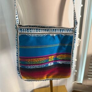• Multicolor woven pattern with blue, pink, yellow, and white accents