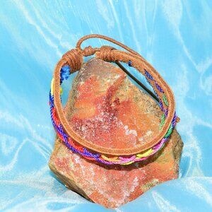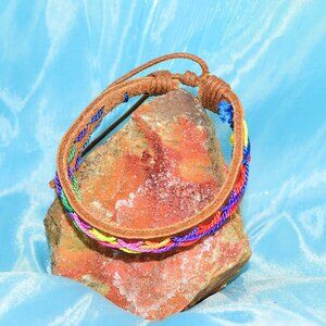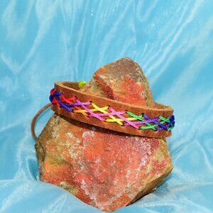 With its cross-stitched punched weave accents in great colors, this bracelet is a favorite in any collection. The waxed tie looks charming and, with its simple sliding feature, makes putting it on and taking it off super easy.